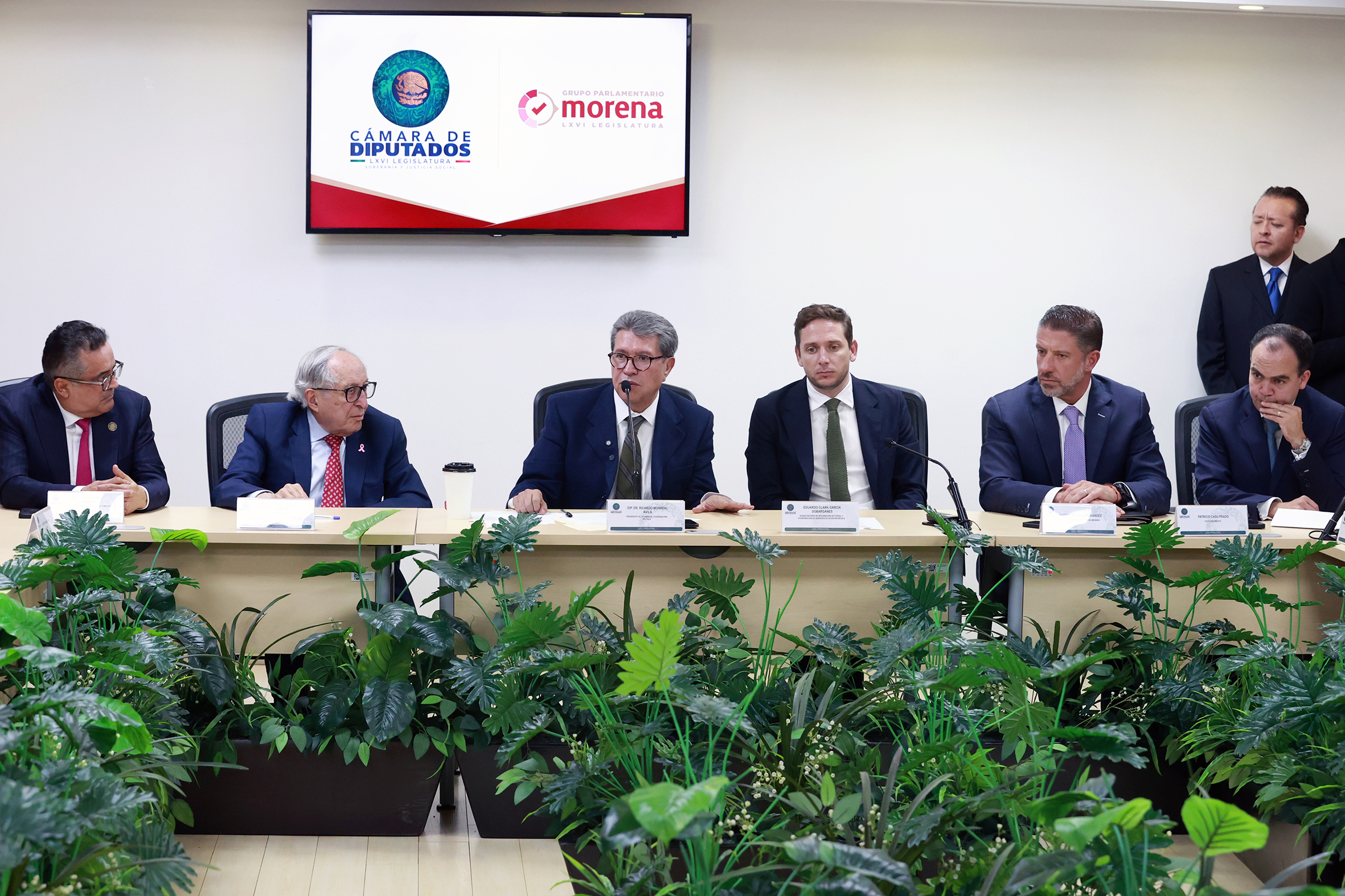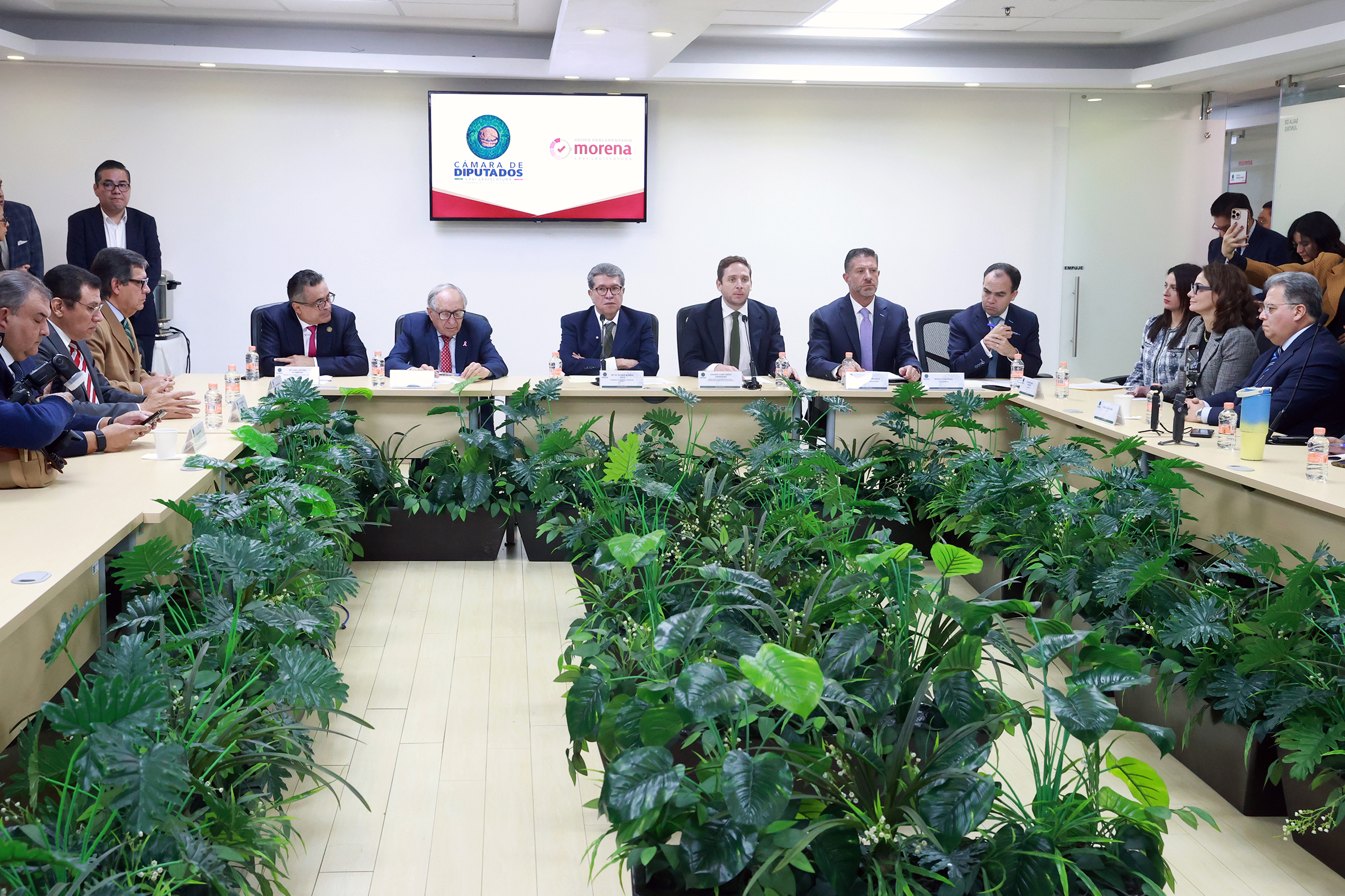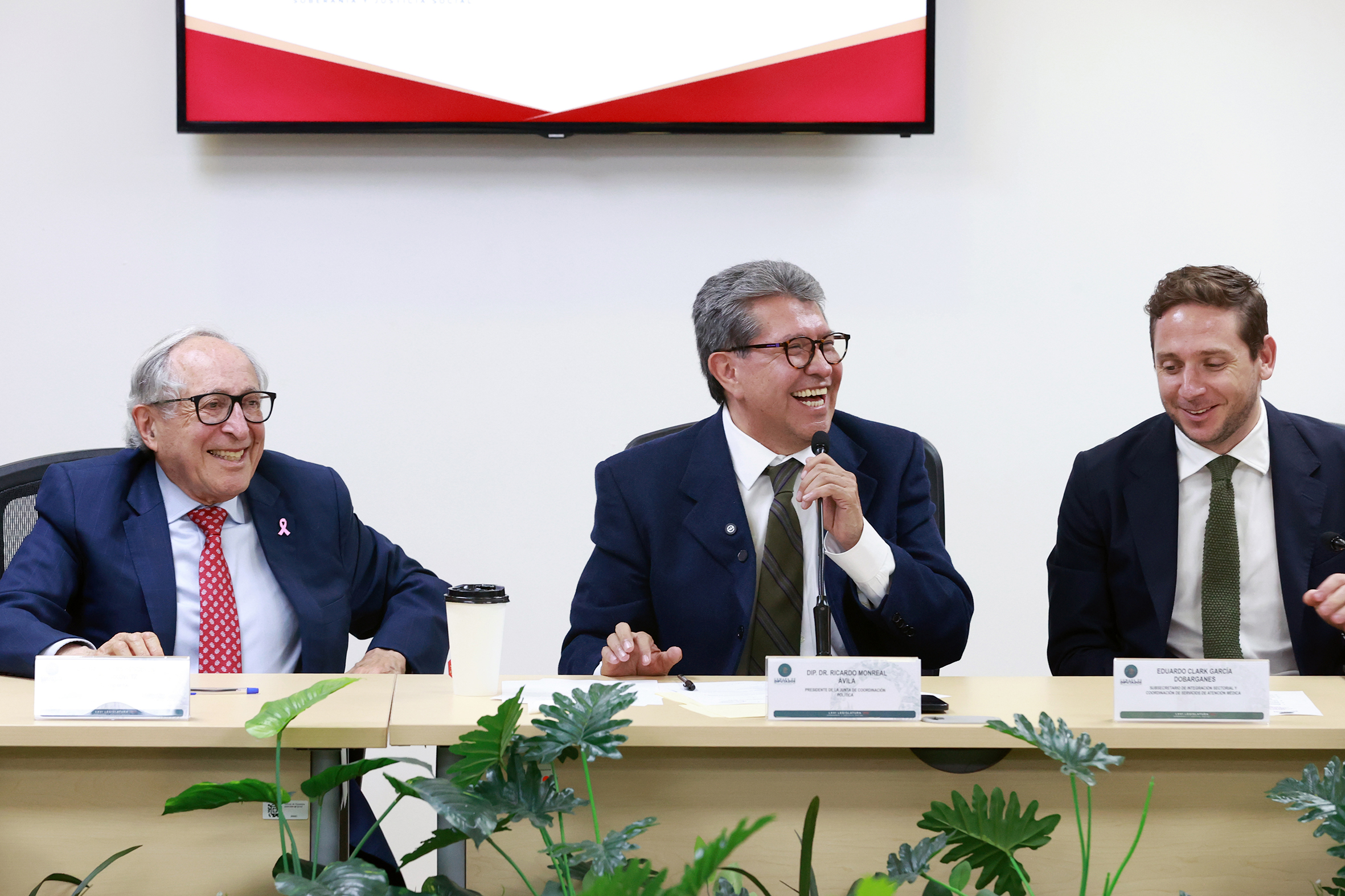 Dip. Ricardo Monreal Ávila, el Secr. de Salud, David Kershenobich y representantes del sector de bebidas azucaradas