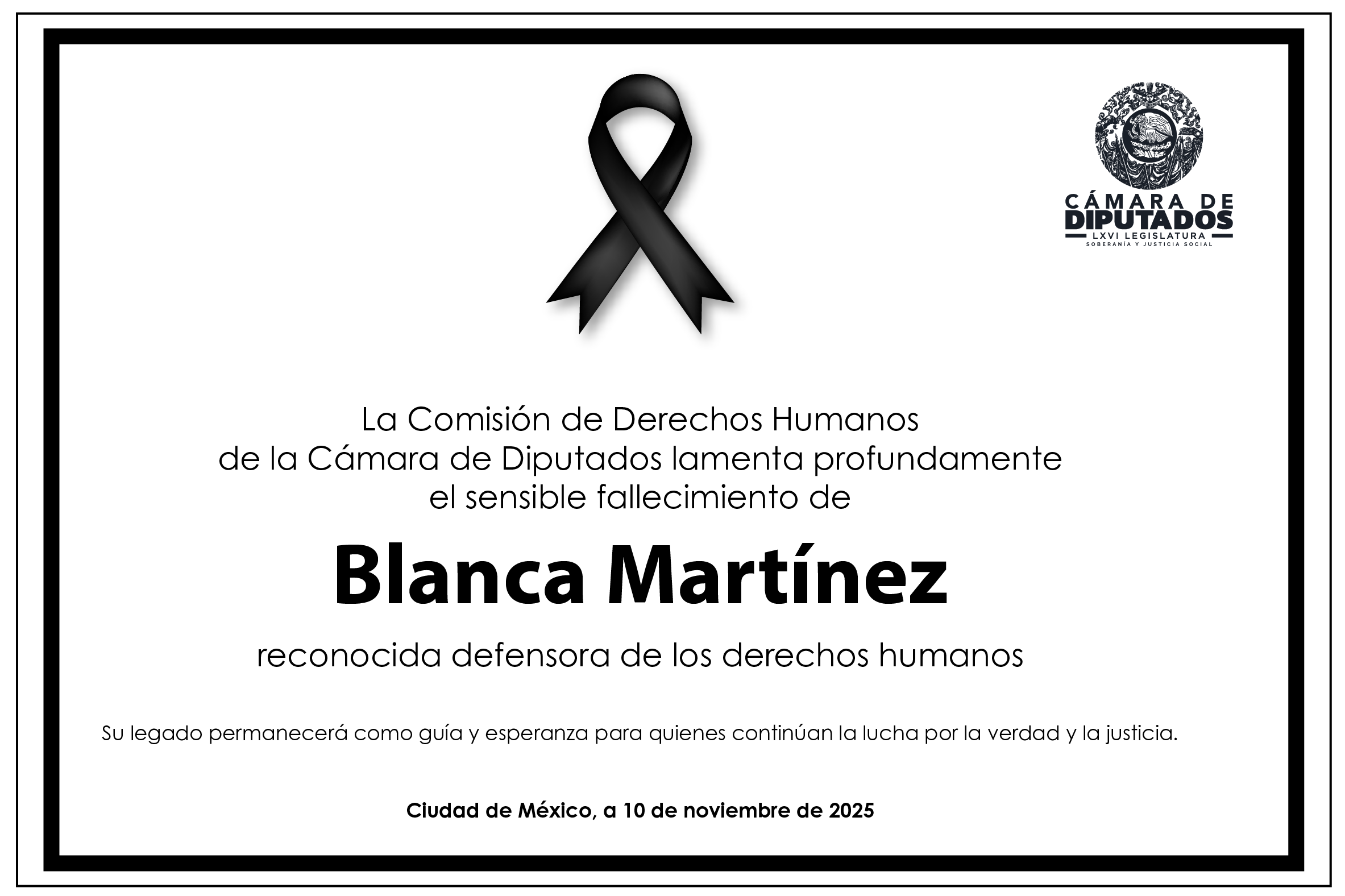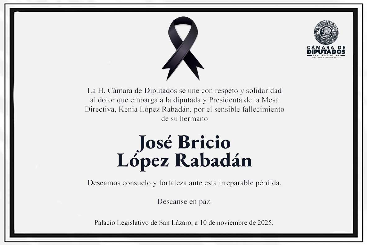 La Cámara de Diputados acompaña con respeto y solidaridad a la Presidenta de la Mesa Directiva, por el sensible fallecimiento de su hermano, José Bricio López Rabadán