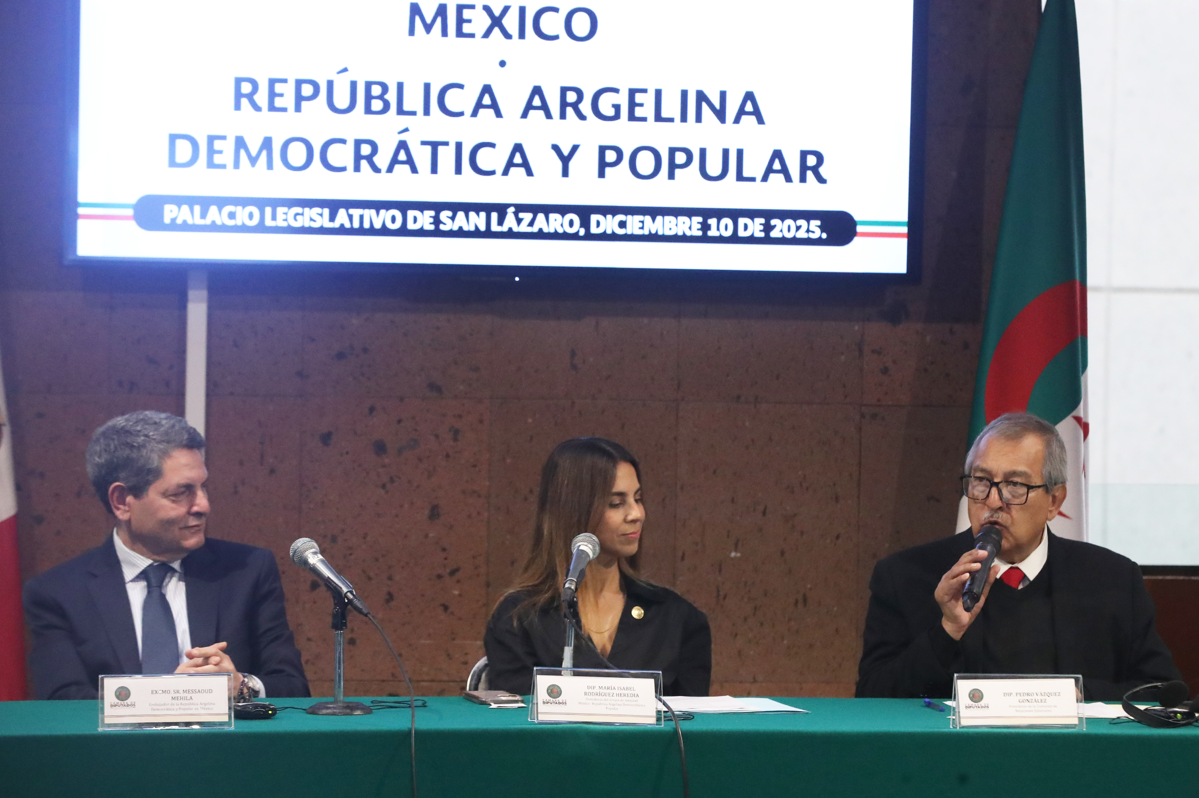 Excmo. Sr. Messaoud Mehila, Dip. María Isabel Rodríguez y Dip. Pedro Vázquez