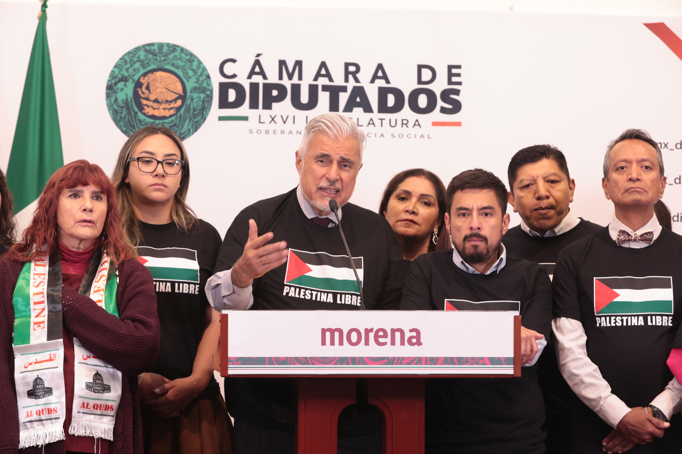 Palacio Legislativo de San Lázaro, 07-10-2025.- Diputadas y diputados de Morena, encabezados por el diputado José Narro Céspedes, expresaron su apoyo a las y los seis mexicanos que fueron detenidos por las fuerzas israelíes que viajaban en la Flotilla Global Sumud para llevar ayuda humanitaria a la Franja de Gaza; exigieron también alto al fuego y fin del genocidio en Palestina.