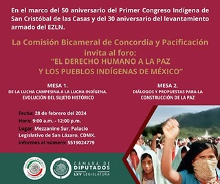 En ese sentido, detalló que en el marco del 50 aniversario del Primer Congreso Indígena de San Cristóbal de las Casas y del 30 aniversario del levantamiento armado del Ejército Zapatista de Liberación Nacional (EZLN), la Cocopa y diversas organizaciones aglutinadas en la Coordinadora de Organizaciones y Pueblos Indígenas de México (COPIM) realizarán el encuentro denominado "El derecho humano a la paz y los pueblos indígenas de México".
