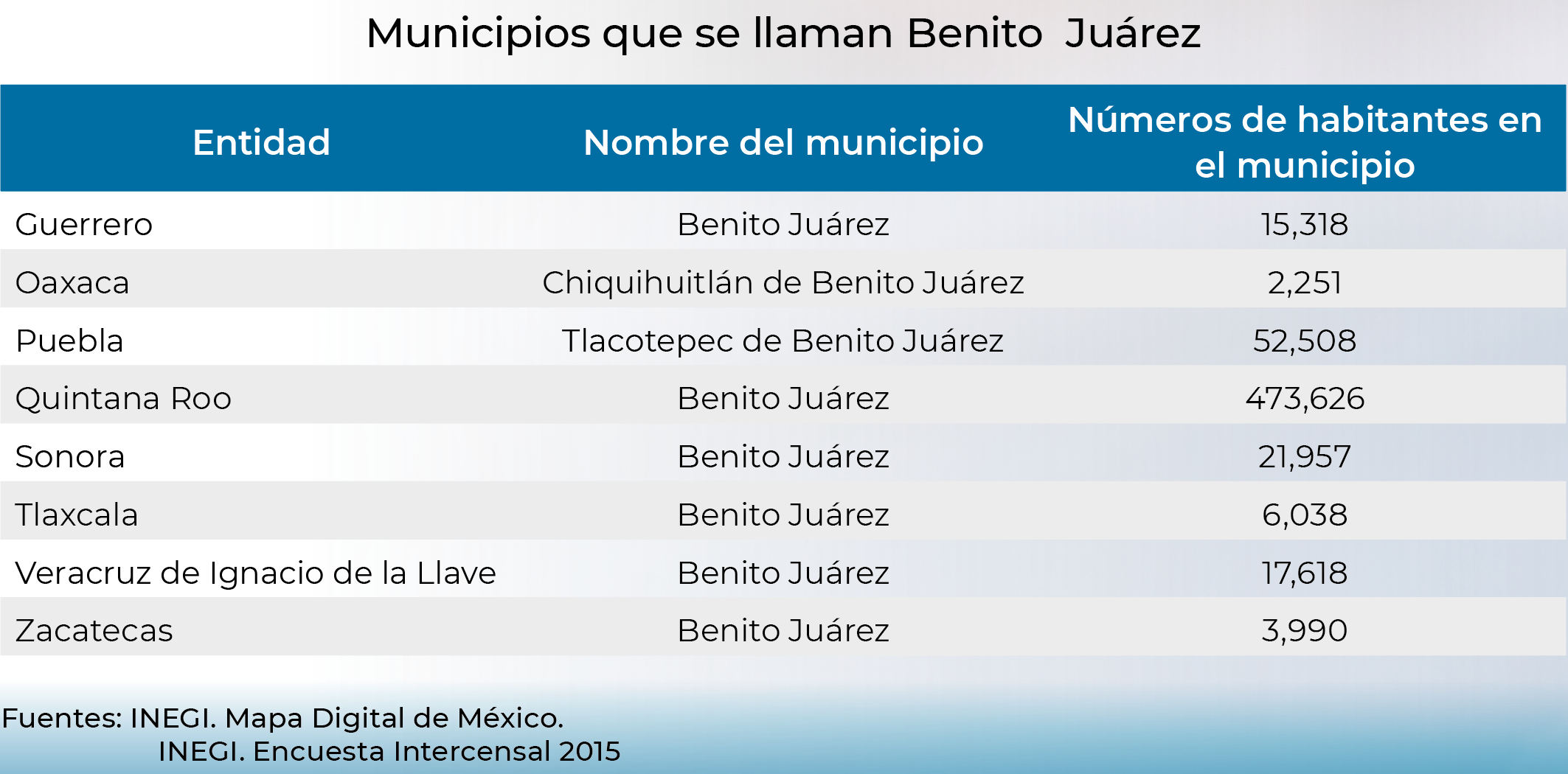 De acuerdo con los datos difundidos por el organismo, en el estado de Guerrero se localiza un municipio llamado Benito Juárez, con una población de 15 mil 318 habitantes; en Oaxaca se encuentra Chiquihuitlán de Benito Juárez, donde viven 2 mil 251 personas, mientras que en Puebla está Tlacotepec de Benito Juárez, con 52 mil 508 habitantes.