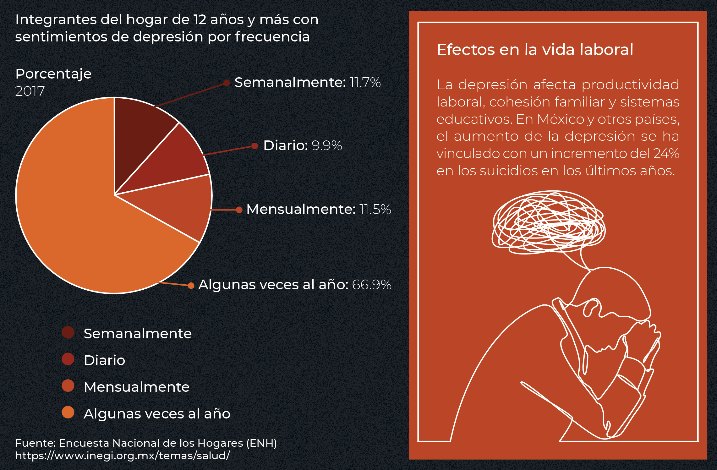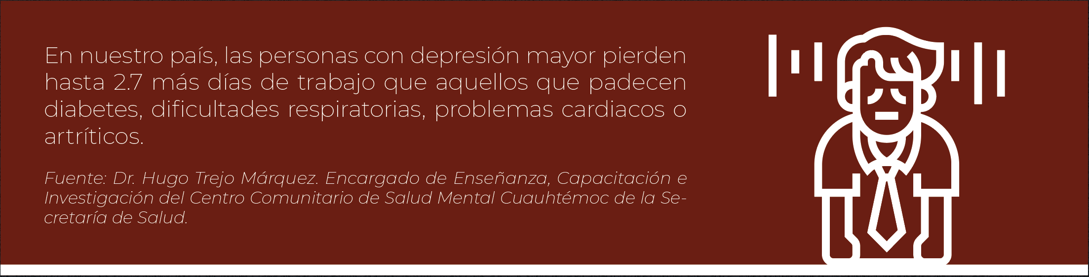 En México, de acuerdo con datos de la Secretaría de Salud del gobierno federal, 3.6 millones de adultos la padecen; el 1 % de esta cantidad son casos severos. Esta condición se caracteriza principalmente por disminución del estado de ánimo, sentimientos de tristeza, dificultad de concentración y alteraciones en el sueño y apetito. Puede suceder que estos síntomas se somatizan y se convierten en dolor, hormigueo o rigidez muscular.