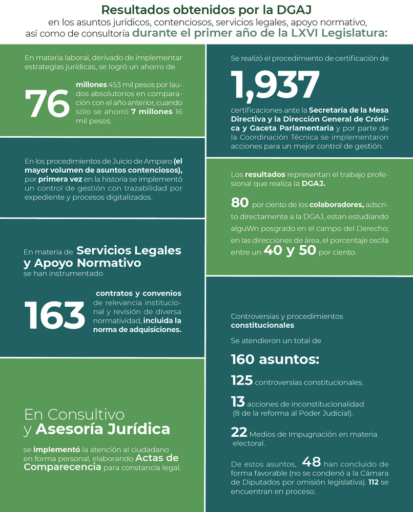 Hay un logro, un resultado muy importante: a diferencia de épocas anteriores, este año logramos un ahorro para la Cámara de Diputados de 76 millones de pesos en laudos absolutorios. Dimos un vuelco en materia laboral para que las resoluciones y las sentencias definitivas salieran a favor y ahorramos esa cantidad.