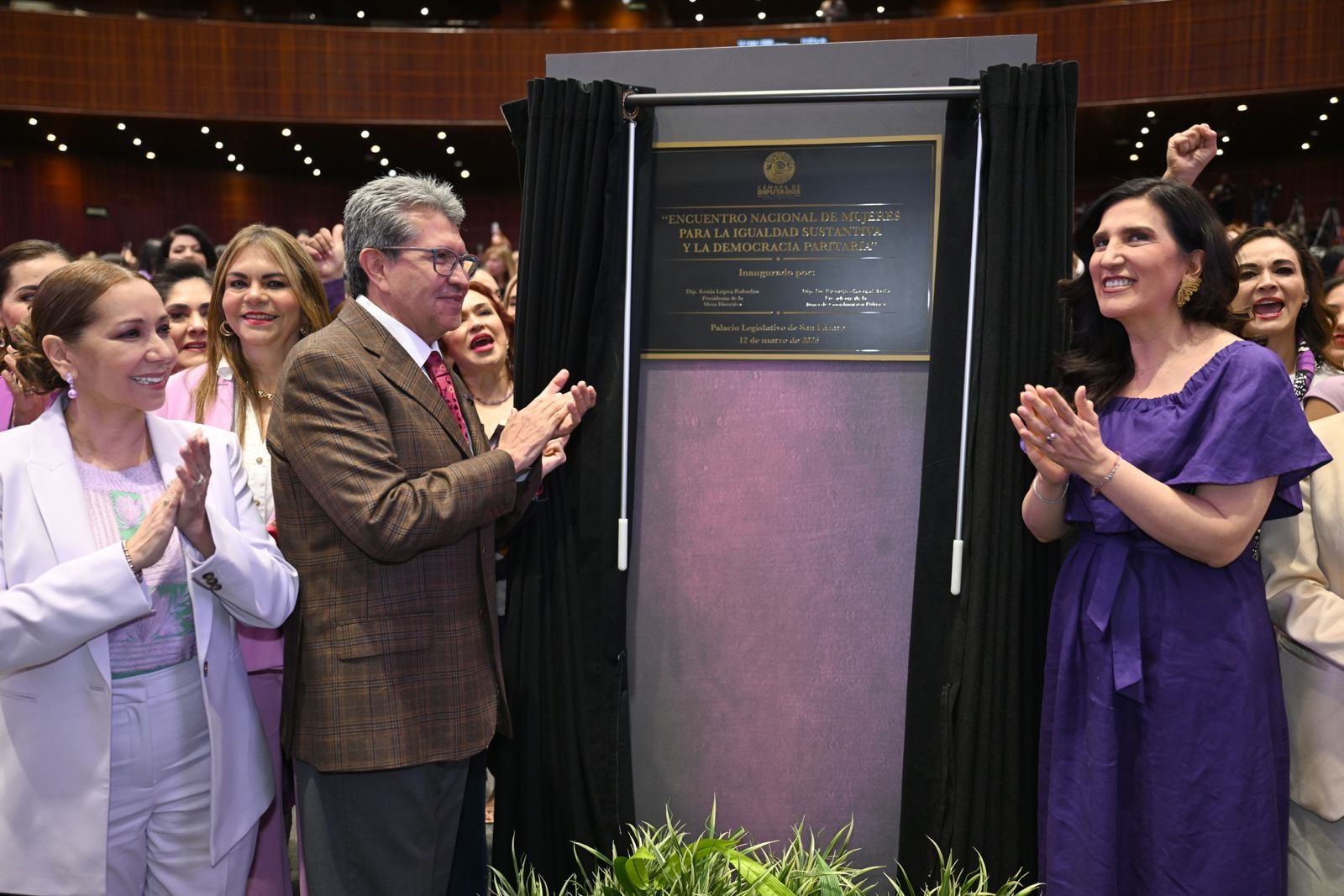 La diputada Kenia López Rabadán, presidenta de la Mesa Directiva y el diputado Ricardo Monreal Ávila, presidente de la Junta de Coordinación Política. develaron una placa alusiva al Encuentro. También se procedió a la toma de la fotografía oficial.